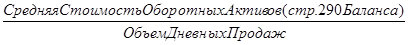 Оборачиваемость разных элементов оборотных активов и кредиторской задолженности рассчитывается в днях исходя из объема дневных продаж (однодневной выручки от реализации). Объем дневных продаж рассчитывается делением выручки от реализации на число дней в периоде (90,180, 270 и 360). Средние (за период) величины оборотных активов и кредиторской задолженности рассчитываются как половинные суммы величин на начальную и конечную даты периода и полных величин на промежуточные даты, деленные Оборачиваемость оборотных средств= Оборачиваемость запасов