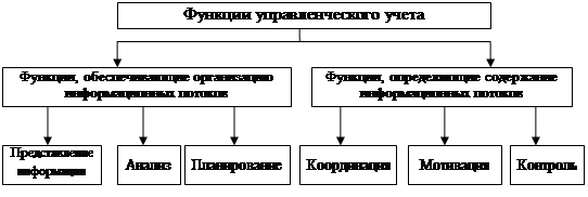 Данные приведенные в таблице 5 показывают, что рентабельность продаж в 2006 году сегмент «Санаторно-курортные» услуги возросла. Вместе с тем возрос и удельный вес расходов. Из-за модернизации котельной она из убыточной в 2005году перешла в рентабельное производство. Но по прежнему убыточным остается сегмент «Жилищный фонд» рентабельность в 2006 году составила -15,6%. Подводя итоги необходимо отметить то, что по нашему мнению сегмент «Санаторно-курортный» необходимо разбить по центрам затрат. С учетом сказанного следует сделать вывод, что успешное развитие предприятия санатория «Тихий Дон» будет зависит от того, насколько эффективно будет деятельность сегмента занимающегося санаторно-курортными услугами, в том числе от внедрения автоматизированного управленческого учета на предприятии. 3. ОРГАНИЗАЦИЯ УПРАВЛЕНЧЕСКОГО УЧЕТА 3.1 Задачи и функции управленческого учета Финансовый учет, будучи по своей природе ретроспективным, всегда имеет дело с фактами, которые уже совершились. В управленческом же учете оперирование данными прошедших периодов – не главное, это лишь средство для того, чтобы извлечь из него уроки и использовать в качестве ориентира при разработке тактики достижения целей организации на будущее. В управленческом учете информация служит целям управления, поэтому, что здесь первично – управление или учет, первенство следует отдать первому. Целью управленческого учета является подготовка и представление менеджерам организации достоверной, полной и своевременной информации для принятия управленческих решений, направленных на достижение целей организации. Система управленческого учета в организации действует посредством ряда функций. Все функции можно разделить на две группы на основании того, форму или содержание информационных потоков определяет данная функция (рисунок 4).