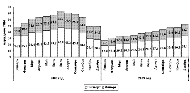 Рис. 2. Помесячная динамика экспортно-импортных операций Российской Федерации в 2008-2009 г.г. Приложение 3.
