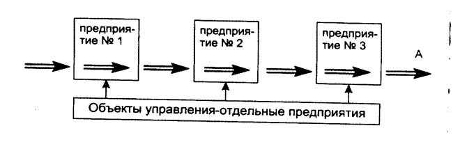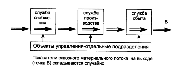 Показатели сквозного материального потока на выходе (точка А) складываются случайно Рис. 2. Традиционный подход к управлению материальным потоком на макроуровне При логистическом подходе объектом управления выступает сквозной материальный поток (рис. 3). На выходе (точка А) сквозной материальный поток имеет заранее спроектированные, контролируемые показатели Рис. 3. Логистический подход к управлению материальным потоком на макроуровне При этом обособленность предприятий - звеньев материалопроводящей цепи в значительной степени преодолевается с целью согласованного управления сквозным материальным потоком. Нужный груз начинает поступать в нужное место, в нужное время, в необходимом количестве, необходимого качества. Продвижение материального потока по всей цепи начинает осуществляться с минимальными затратами. На микроуровне цепь, через которую последовательно проходит некоторый материальный поток, чаще всего состоит из различных служб одного предприятия (рис. 4). При традиционном подходе задача совершенствования сквозного материального потока внутри предприятия, как правило, не имеет приоритетного значения ни для одного из подразделений. Показатели материального потока на выходе из предприятия, так же как и в первом примере, имеют случайное значение и далеки от оптимальных.