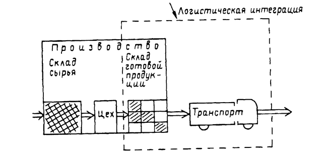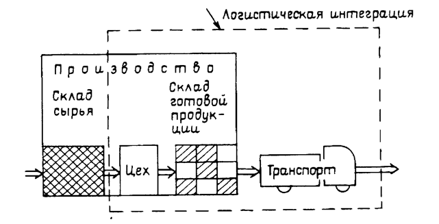 Следует отметить, что совместное решение отдельных задач по управлению материальными потоками намного сложнее их обособленного решения. Здесь зачастую требуются иные методы, а также иная подготовка специалистов. Второй этап в развитии логистики приходится на 80-е годы XX века. В этот период интеграционная основа логистики расширилась и стала охватывать производственный процесс. С точки зрения развития логистики 80-е годы характеризуются следующим: — быстрый рост стоимости физического распределения: — рост профессионализма менеджеров, осуществляющих управление логистическими процессами; — долгосрочное планирование в области логистики; — широкое использование компьютеров для сбора информации и контроля за логистическими процессами; — централизация физического распределения; — резкое сокращение запасов в материалопроводящих цепях; — четкое определение действительных издержек распределения; — определение и осуществление мер по уменьшению стоимости продвижения материального потока до конечного потребителя Графически глубина логистической интеграции, достигнутая в 80 - е годы, представлена на рис. 7.