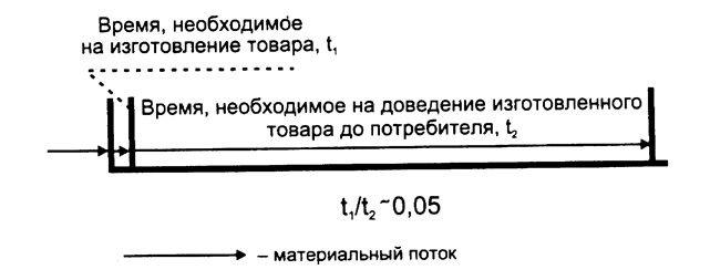 Рис. 10. Соотношение времени на собственно производство товара (t1 ) и времени на доведение изготовленного товара до потребителя (t2 ) Логистический подход создает также условия для улучшения многих других показателей функционирования материалопроводящей системы, так как совершенствуется ее общая организация, повышается взаимная связь отдельных звеньев, улучшается управляемость. Совокупный экономический эффект от использования логистики, как правило, превышает сумму эффектов от улучшения перечисленных показателей. Это объясняется возникновением у логистически организованных систем так называемых интегративных свойств,* то есть качеств, которые присущи всей системе в целом, но не свойственны ни одному из элементов в отдельности.