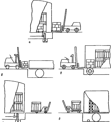 Рис- 65. Различные варианты выполнения погрузочно-разгрузочных работ с тарно-штучными грузами: а, б, в — механизированным способом; г, д — с помощью средств малой механизации Следующей, существенной с точки зрения совокупного логистического процесса, операцией является приемка поступивших грузов по количеству и по качеству. Решения по управлению материальным потоком принимаются на основании обработки информационного потока, который не всегда адекватно отражает количественный и качественный состав материального потока. В ходе различных технологических операций в составе материального потока могут происходить несанкционированные изменения, которые носят вероятностный характер, такие, как порча и хищения грузов, сверхнормативная убыль и др. Кроме того, не исключены ошибки персонала поставщика при формировании партий отгружаемых товаров, в результате которых образуются недостачи, излишки, несоответствие ассортиментного состава. В процессе приемки происходит сверка фактических параметров прибывшего груза с данными товарносопроводительных документов. Это дает возможность скорректировать информационный поток. Проведение приемки на всех этапах движения материального потока от первичного источника сырья до конечного потребителя позволяет постоянно актуализировать информацию о его количественном и качественном составе. На складе принятый по количеству и качеству груз перемещается в зону хранения. Тарно-штучные грузы могут храниться в стеллажах или в штабелях. Некоторые способы укладки гpyзов на хранение приведены на рис. 66. Следующая операция - отборка товаров из мест храпения может производиться двумя основными способами: - отборка целого грузового пакета: - отборка части пакета без снятия поддона. Эта операция может выполняться с разной степенью механизации. На рис. 66г изображена операция отборки с помощью средств малой механизации, на рис. 66 а, б, в - механизированная отборка. В высотных складах тарно-штучных грузов отборщик в специальном стеллажном подъемнике передвигается вдоль ячеек стеллажа, отбирая необходимый товар. Такие склады называют с т а- т и с т и ч е с к и м и. Другой вариант отборки реализуется в так называемых высотных динамических складах, здесь стеллажный подъемник автоматически подается к ячейке с необходимым грузом. С помощью телескопического вилочного захвата грузовой пакет вынимается из места хранения и транспортируется к рабочему месту отборщика. Необходимое количество груза отбирается, остальное подается назад в место хранения.