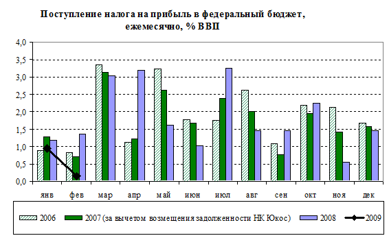 | Содержание Введение…………………………………………………………………………..3 Налог на прибыль организаций на 2009-2010 годы……………………………4 Анализ поступления налога на прибыль в 2008-2009 годах………………….11 Заключение……………………………………………………………………….13 Список использованных источников…………………………………………...14 Введение Налоги являются необходимым звеном экономических отношений в обществе с момента возникновения государства. В системе налогов РФ одним из наиболее значимых является налог на прибыль. Вопросы, связанные с этим налогом имеют большое значение как для государства, так как он является важной доходной статьей бюджета, так и для отдельных предприятий, так как сумма его выплат обычно одна из самых крупных. В последнее время возникает множество споров по поводу эффективности применения этого налога. Налог на прибыль имеет двоякое значение: фискальное и регулирующее. Во-первых, налог является важным доходом бюджета, во-вторых, налог на прибыль играет роль экономического инструмента регулирования экономики. Государство, лишенное собственности, не может управлять производственным процессом административными методами. Спущенные сверху директивные указания, не подкрепленные экономическими стимулами, вряд ли будут выполняться частными предприятиями, акционерными обществами, деятельность которых определяется в первую очередь требованиям рынка и законом стоимости. В связи с этим управление хозяйственными процессами возможно лишь экономическими методами, и, прежде всего, набором элементов налогообложения прибыли: ставками, расчетом объекта обложения, льготами и санкциями. Изменяя обложение прибыли юридических лиц этими методами, государство способно оказать серьезное давление на динамику производства: стимулировать его развитие либо сдерживать движение вперед. Действующий налог на прибыль предприятий и организаций в России регулирующую роль выполняет слабо в силу неустойчивой экономической ситуации в стране, а также существования слабой налогооблагаемой базы. Налог на прибыль предприятий и организаций действует на всей территории страны. Налог на прибыль организаций на 2009-2010 год. Изменения, внесенные в Налоговый кодекс Российской Федерации (далее по тексту - Кодекс) в 2008 году, предусматривали следующее: - начиная с 1 января 2009 года ставка налога на прибыль организаций снижена с 24 процентов до 20 процентов; - в четвертом квартале 2008 года, вопреки общему правилу и не дожидаясь начала нового налогового периода, налогоплательщики получили право перейти на уплату налога по фактически полученной прибыли и отказаться, таким образом, от уплаты авансовых платежей, рассчитанных исходя из достигнутого уровня прибыли за предыдущий отчетный период (9 месяцев); - в период с 1 сентября 2008 г. по 31 декабря 2009 г. предельная величина процентов по долговым обязательствам, которая может быть учтена в расходах для целей налогообложения прибыли, установлена в размере ставки рефинансирования Центрального банка Российской Федерации, увеличенной в 1,5 раза, - при оформлении долгового обязательства в рублях и равной 22 процентам - по долговым обязательствам в иностранной валюте (ранее по долговым обязательствам в рублях она равнялась ставке рефинансирования Центрального банка Российской Федерации, увеличенной в 1,1 раза, а по об