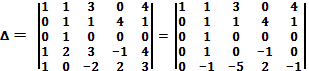 Решение: Используя алгебраические преобразования, получим в первом столбце в четвертой и пятой строке нули. Для этого от элементов четвертой строки отнимем элементы первой строки и полученный результат запишем на место элементов четвертой строки матрицы. От элементов пятой строки отнимем элементы первой строки и полученный результат запишем на место элементов пятой строки матрицы. Получим: