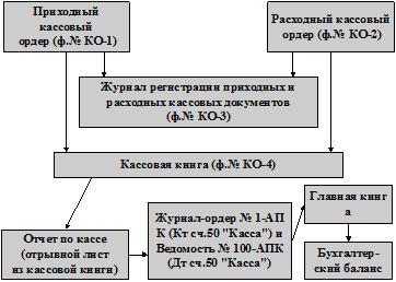 Рисунок 3 - Схема учета денежных средств в кассе СПК « Печатники». Из рис. 3 видно, что регистром бухгалтерского учета, в котором отражают кассовые операции в Хозяйстве, является журнал-ордер № 1-АПК. Его используют для фиксирования кредитовых оборотов счета 50. Во второй части журнала-ордера - ведомости отражают дебетовые обороты счета 50. Основанием для бухгалтерских записей в журнале-ордере являются проверенные отчеты кассира с приложенными к ним первичными документами. Записи в журнале-ордере производят итогами за день на основании расходной части отчетов кассира с приложенными первичными документами. Предварительно первичные документы группируют по корреспондирующим счетам и однородные операции (с одинаковой корреспонденцией) отражают общей суммой за день. Каждый отчет кассира занимает в журнале-ордере одну строку. В разделе дебетовых оборотов накапливаются в разрезе корреспондирующих счетов дебетовые обороты по счету 50 «Касса». Одновременно эти суммы отражают в соответствующих журналах-ордерах по кредитовому признаку (журналы-ордера №2,3,4 и др.). Записи по дебету счета делают аналогичным путем, т. е. на основании отчетов кассира (только в данном случае - по их приходной части) с предварительной группировкой документов по корреспондирующим счетам. Остаток средств в кассе показывают в ведомости на начало и конец каждого месяца. На протяжении месяца для контроля и оперативных целей используют данные об остатках средств, приведенные в отчетах кассира. Сальдо на конец месяца по счету 50 «Касса» выводят следующим образом: к сальдо на начало месяца прибавляют итог дебетового оборота за месяц и вычитают итог кредитового оборота за месяц, отраженный в журнале-ордере № 1-АПК. Полученное сальдо сверяют с остатком кассы, числящимся по последнему отчету кассира, и отражают в ведомости дебетовых оборотов (во второй части журнала-ордера) как сальдо на конец месяца. Журнал-ордер № 1-АПК является регистром месячного обращения. Итоги кредитовых оборотов по счету 50 с подразделением их на корреспондирующие счета переносят ежемесячно из журнала-ордера № 1-АПК в Главную книгу следующим образом: общий кредитовый оборот из журнала-ордера записывают в Главную книгу в кредит счета 50, а составляющие его суммы по дебетуемым счетам переносят в дебет соответствующих корреспондирующих счетов. Прежде чем перенести итоги журнала-ордера № 1-АПК по кредитовым оборотам в Главную книгу, бухгалтер по каждому корреспондирующему счету сверяет их с данными других регистров. Так, кредитовые обороты по журналу-ордеру № 1-АПК сверяются: по счету 51 - с соответствующими данными в разделе дебетовых оборотов журнала-ордера № 2-АПК, по счету 71 - с данными журнала-ордера № 7-АПК и т.д. После сверки итоги журнала-ордера № 1-АПК разносятся в Главную книгу. Бухгалтерские записи, отраженные в журнале-ордере № 1-АПК за февраль 2007 г., показаны в табл.10. Таблица 10 - Бухгалтерские записи в журнале-ордере № 1 СПК « Печатники» за февраль 2007 г.