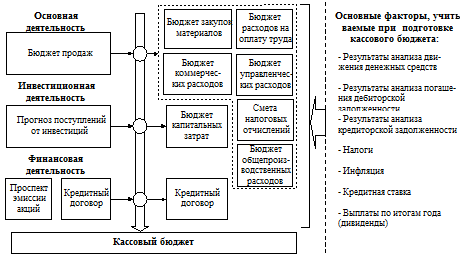 Рисунок 4 - Схема управления денежными средствами предприятия Управление денежным потоком особенно важно для предприятия с точки зрения необходимости: - планирования временных параметров капитальных затрат; - управления оборотным капиталом (оценки краткосрочных потребностей в наличных средствах и управления запасами); - управления затратами и их оптимизации с точки зрения более рационального распределения ресурсов предприятия в процессе производства; - управления капитальными потребностями (финансирование за счет собственных средств или кредитов банка); - управления экономическим ростом. - Проблемы в управлении денежными средствами состоят в следующем: - менеджеры не имеют полной оперативной информации об источниках денежных поступлений, о суммах и сроках предстоящих платежей; - финансовые потоки разрознены и несогласованны по времени; - есть случаи утери платежных документов; кассовый план создается из обрывков информации; - решение о распределении денежных средств принимается при мощном давлении со стороны различных служб; - запросы на финансирование часто не соответствуют реальным потребностям; - решения о привлечении кредитов принимаются без должной оценки их необходимой величины и сроков погашения. Чтобы избежать указанных недостатков, следует внедрить в практику работы бухгалтерии метод бюджетирования, предполагающий составление кассовых бюджетов. Цель бюджетирования денежных средств состоит в расчете необходимого их объема и определении моментов времени, когда у компании ожидается недостаток или избыток денежных средств для того, чтобы избежать кризисных явлений и рационально использовать денежные средства предприятия. Кассовый бюджет – это подробная смета ожидаемых поступлений и выплат денежных средств за определенный период, включающая как конкретные статьи поступлений и выплат, так и их временные параметры. Кассовый бюджет является составной частью Основного бюджета предприятия и использует данные бюджетов продаж, закупок, затрат на оплату труда и др. Для более точного расчета объема денежных средств руководству предприятия необходимо знать конкретные статьи поступлений и расходов денег, а также временные параметры этих процессов. Для решения этой задачи используется бюджетирование денежных средств. В то же время бюджет денежных средств, как и все прочие бюджеты, во многом зависит от субъективных оценок и прогнозов (например, прогноза продаж, оценки периодов погашения дебиторской задолженности и т.п.), следовательно, общая ошибка расчетов (возможные отклонения) ведет к значительному искажению конечных результатов и может послужить основой для принятия неправильного управленческого решения. Разработка бюджета денежных средств, как и других бюджетов, является результатом тесного сотрудничества всех служб предприятия и должна быть регулярной, поскольку разовые бюджеты на основе единичных оценок могут приводить к большим отклонениям и неправильным управленческим решениям. Регулярность разработки бюджета позволит руководителю определить, какие факторы оказывают самое большое воздействие на величину денежного потока, и направить основные усилия на более точную оценку этих факторов. Таким образом, кассовый бюджет позволяет: 1. Своевременно определять потребность в объеме и срок