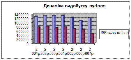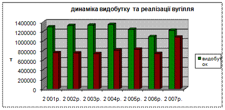 Рисунок 1.2 – Динаміка видобутку вугілля Зрівнявши показники, ми бачимо, що шахта видала концентрату в 2002 році в порівнянні з 2001 роком на 50725 т більше, у 2003 році в порівнянні з 2002 роком на 92781 т менше, а в 2004 році в порівнянні з 2003 роком на 47163 т більше, в 2005 порівняно з 2004 на 83485,9 т менше, в 2006 порівняно з 2005 на 26692,7 менше, а 2007 порівняно з 2006 на 199075 т менше. Проте об’єми видобутку рядового вугілля збільшуються. Підприємство домагається такого результату завдяки збільшенню середньодобового видобутку вугілля та зменшенню загально шахтних простоїв. Можна побачити, що в 2007 році обсяг видобутку концентрату значно зменшився, що пов’язано зі зносом обладнання. Тому в найближчий час планується переоснащення. Таблиця 1.3 – Економічні показники реалізації вугілля по рокам