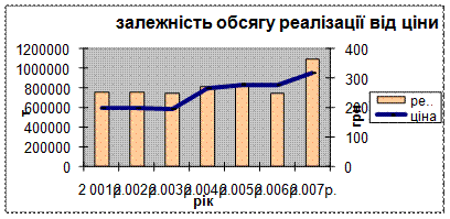 Рисунок 2.20 – Залежність обсягу реалізації вугілля від ціни. У цій моделі обсяг реалізації вугілля у кількісному виразі пропонується залишити незмінним, а збільшити обсяг реалізації, що має вартісний вираз. У моделі також пропонується залишити усі витрати, як постійні, так і змінні, незмінними і основні зміни проводити тільки у розрізі ціни, спираючись на ціни фірм-конкурентів. Це робитиметься для того, щоб підприємство мало змогу збільшити ціни на своє вугілля, та при цьому не втратити постійних клієнтів, але й отримати нових. Функціонал для моделі, що знаходиться за рахунок моделі порівняння й аналізу цін на запропоновану марку вугілля шахтою "Добропільська" і середньою ціною по Україні має вигляд, що наведено у формулі: