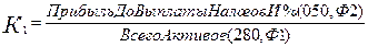 Даний коефіцієнт говорить про те, що підприємство мало недостатньо ліквідні активи у 2006 році, тому що коефіцієнт мав негативне значення на початку звітного періоду (-0,16). У 2007 році економічний стан підприємства стабілізувався (2,4). Нормативне значення лежить у діапазоні від 1,5 до 2. Коефіцієнт Альтмана :