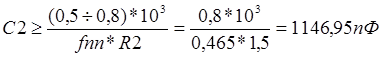 4. Определяю общее сопротивление нагрузки постоянному току: Rн= =R1+R2=2,2+1,5=3,7кОм Так как Rн» /Rн= =3,12/3,7=0,84>0,8 то нелинейные искажения не будут превышать нормы. 5. Определяю величину эквивалентной ёмкости, шунтирующей нагрузку детектора: 6. Определяю величину ёмкости С2, обеспечивающую фильтрацию на промежуточной частоте: