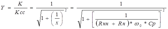 1.3.3 Распределение между трактами приёмника частотных и нелинейных искажений: Частотные искажения создаются всеми каскадами приёмника. В каскадах с резонансными контурами (входная цепь, УПЧ) они могут возникать, когда резонансная характеристика контуров недостаточно широкая, за счёт чего крайние частоты спектра принимаемого сигнала будут пропускаться хуже, чем средние. Общую величину частотных искажений ВЧ части приёмника определяют из выражения: Мобщ,дб=Мпрес +МУПЧ +МУННЧ +МУНЧ Для ДВ: Мобщ,дб=3дб+6дб+1,5дб+1,5дб=12дб Для СВ: Мобщ,дб=2дб+6дб+1,5дб+1,5дб=11дб Проверяю выполнение условия Мобщ,дб£М: Для ДВ: 12£12, Для СВ: 11£12 Условие выполняется для ДВ и для СВ, следовательно, частотные искажения приёмника не выходят за границы заданных частотных искажений. Причиной нелинейных искажений является нелинейность характеристик усилительных приборов и диодов. Наибольшие нелинейные искажения создаются на детекторе и УНЧ. Общую величину нелинейных искажений определяют из выражения: Кг.общ =Кг. d +Kг.УНЧ , ориентировочная величина искажений, создаваемых детектором составляет 1-2%, а нелинейные искажения УНЧ 3-5%. Кг.общ =2%+5%=7% Проверяю выполнение условия Кг.общ £Кг , где Кг - заданные нелинейные искажения по ТУ 7%£8%, условие выполняется, следовательно, нелинейные искажения приёмника не выходят за границы заданных нелинейных искажений. 1.3.4. Расчёт частотной характеристики УНЧ: Расчёт АЧХ ведётся путём подставления значений частоты в формулу нормированного коэффициента усиления Y: