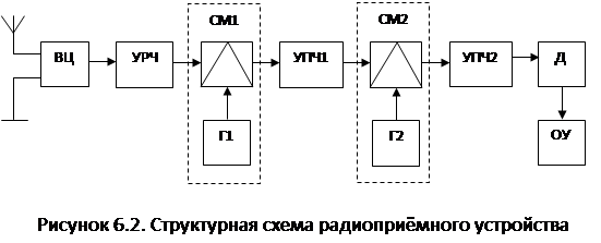 4.2 Выбор структурной схемы приёмника Современные радиоприёмные устройства строятся, как правило, по супергетеродинной схеме с одним или двумя преобразователями частоты. Двойное преобразование частоты, характерно для профессиональных радиопередающих устройств, позволяет за счет высокой первой промежуточной частоты существенно увеличить подавление зеркальной помехи, а за счёт низкой второй промежуточной частоты получить хорошую избирательность по соседнему каналу. Структурная схема получаемого радиоприёмного устройства изображена на рис. 6.2.