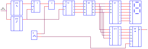 Рисунок 1. Структурная схема При поступлении переднего фронта измеряемого импульса детектор фронтов (ДФ) формирует управляющий сигнал на начало счета. Формируемые тактовым генератором (ТГ) импульсы поступают на схему подсчета тактовых импульсов (СУ). При поступлении заднего фронта измеряемого импульса ДФ формирует сигнал останавливающий .счет. При этом количество подсчитанных импульсов выводится на схему отображения (УО) и через схему преобразования параллельного кода в последовательный (ПК) в устройство обработки. 1.2 Разработка функциональной схемы устройстваДетектор фронтов состоит из двух ждущих мультивибраторов и триггера. Один ждущий мультивибратор предназначен для выделения заднего фронта импульса и сбрасывает триггер. Другой ждущий мультивибратор предназначен для выделения переднего фронта импульса и переключает триггер в единичное состояние и вырабатывает сигнал сброса счетчика. Оба мультивибратора вырабатывают импульсы длительности необходимой для надежного переключения триггера. Схема подсчета тактовых импульсов состоит из элемента «И» и счетчика. Элемент «И» пропускает тактовые импульсы от генератора, только если триггер находится в единичном состоянии. Счетчик обеспечивает подсчет импульсов. Схема отображения содержит регистр, дешифратор и индикаторы. Использование регистра позволяет избежать мерцания во время подсчета. Запись в регистр выполняется только по окончанию подсчета длительности импульса. Дешифратор необходим для преобразования двоично-десятичного кода в код обеспечивающий отображение соответствующей цифры.