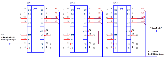 Для реализации схемы подсчета тактовых импульсов используем счетчики К155ИЕ6. В этих счетчиках имеется возможность последовательного подключения с целью увеличения разрядности. При этом выход «>15» подключается к тактовому входу следующего счетчика. Для получения на выходе 12 разрядного двоично-десятичного кода требуется 3 счетчика К155ИЕ6. Вывод переноса последнего счетчика используем для индикации ошибки.