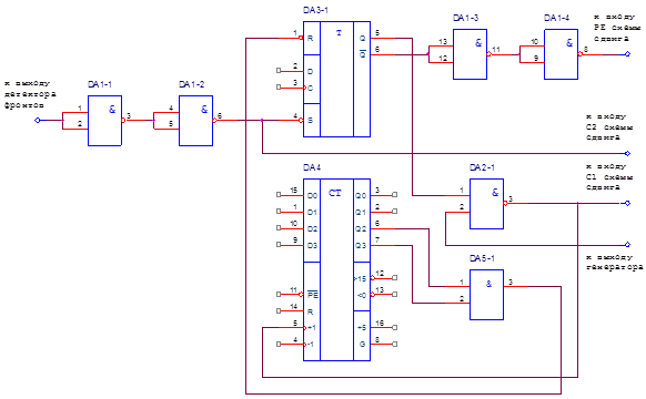 Примем значение из номинального ряда Для получения частот в 10000Гц и 1200Гц необходимо применить делители частоты. В качестве делителей удобно использовать счетчики К155ИЕ2 и К155ИЕ4. Для реализации деления на 5 используем счетчик К155ИЕ2 (DA3) подавая тактовые импульсы на вход C1 на выходе Q1 получим частоту деленную на 5. Для реализации деления на 6 используем счетчик К155ИЕ4. 2.3 Схема подсчета тактовых импульсовРисунок 8. Схема подсчета тактовых импульсов