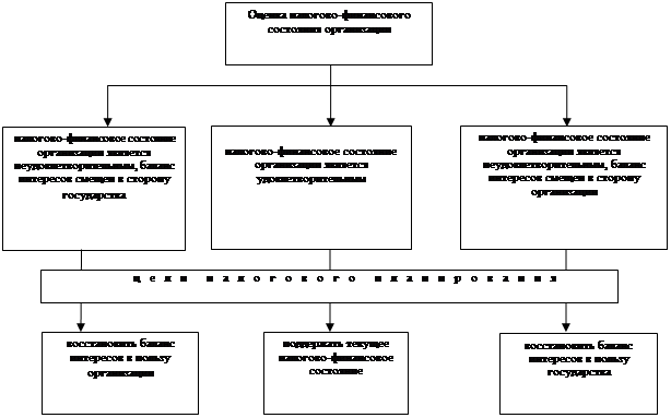 Рисунок 4 - Зависимость целей налогового планирования от результатов оценки налогово-финансового состояния организации. После постановки цели налогового планирования формулируются задачи, возможные варианты, постановки которых представлены на рис.3.
