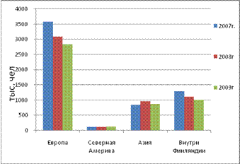 В 3 квартале 2009 года наблюдается сокращение объемов пассажиропотоков практически по всем географическим направлениям, за исключением Северной Америки, где прирост составил 13,5% по отношению к предыдущему году (см рис.3). Коэффициент пассажирской загрузки составил 82,8%. Объяснить увеличение пассажиропотока на данном направлении можно за счет удобной транзитной стыковки в аэропорту Хельсинки, относительно не высокой ценой перелета и введением в расписание дополнительных трех рейсов, в результате чего число рейсов достигло десяти в неделю. Если сравнивать пассажиропотоки на регулярных и чартерных рейсах, то из основных производственных показателей видно, что сокращение объемов пассажиропотоков в большей степени произошло на регулярных рейсах, в то время как на чартерных рейсах объемы остались на уровне 2007 года (см. рис.4).