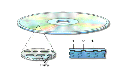 Схема конструкции оптического видеодиска: 1 — наружный слой из прозрачной пластмассы; 2 — металлизированная отражающая дорожка записи; 3 — твердая непрозрачная пластиковая основа.[4] На оптический диск информация записывается и считывается с помощью сфокусированного лазерного луча. В зависимости от возможности использования для записи и считывания оптические диски делят на два вида: 1. WORM (Write Once Read Many) – накопители, предназначенные для записи информации и её хранения; 2. CD-ROM (Compact Disk Read Only Memory) - накопители, предназначенные для чтения информации. Оптические диски можно разделить на типы: · Аудио-компакт-диск - это диск с постоянной (нестираемой) звуковой информацией, записанной в двоичном коде; · CD-ROM – диск с постоянной памятью, предназначенный для хранения и чтения значительных объёмов информации. Он содержит компьютерную информацию, которая считывается дисководом, подключённым к ПЭВМ; · Видео-компакт-диск – диск, на котором в цифровой форме записывается текстовая, изобразительная и звуковая информация, а также программы ЭВМ; · DVD-диск – разновидность нового поколения оптических дисков, на котором в цифровой форме записывается текстовая, видео и звуковая информация, а также компьютерные данные; · Магнитооптический диск – диски состоящие из разных комбинаций гибкого магнитного диска, винчестера и оптического диска. 4. Носители на базе флэш-памяти Один из самых современных и перспективных носителей документированной информации – твёрдотельная флэш-память, представляющая собой микросхему на кремниевом кристалле. Этот особый вид энергонезависимой перезаписываемой полупроводниковой памяти. Название связано с огромной скоростью стирания микросхемы флэш-памяти. Для хранения информации флэш-носители не требуют дополнительной энергии, которая необходима только для записи. Причём по сравнению с жёсткими дисками и носителями CD-ROM для записи информации на флэш-носителях требуется в десятки раз меньше энергии, поскольку не нужно приводить в действие механические устройства, как раз и потребляющие большую часть энергии. Сохранение электрического заряда в ячейках флэш-памяти при отсутствии электрического питания обеспечивается с помощью так называемого плавающего затвора транзистора. Носители на базе флэш-памяти могут хранить записанную информацию очень длительное время (от 20 до 100 лет). Будучи упакованы в прочный жёсткий пластиковый корпус, микросхемы флэш-памяти способны выдерживать значительные механические нагрузки (в 5-10 раз превышающие предельно допустимые для обычных жёстких дисков). Надёжность такого рода носителей обусловлена и тем, что они не содержат механически движущихся частей. В отличие от магнитных, оптических и магнитооптических носителей, здесь не требуется применение дисководов с использованием сложной прецизионной механики. Их отличает также бесшумная работа. Кроме того, эти носители очень компактны. Информацию на флэш-носителях можно изменять, т.е. перезаписывать. Помимо носителей с единственным циклом записи, существует флэш-память с количеством допустимых циклов записи/стирания до 10000, а также от 10000 до 100000 циклов. Все эти типы принципиально не отличаются друг от друга. Несмотря на миниатюрные размеры, флэш-карты обладают большой ёмкостью памяти, составляющей многие сотни Мбайт. Они универсал