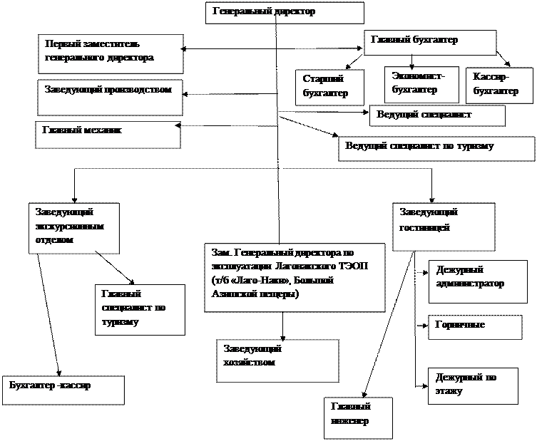 Рис. 2.1 Организационная структура управления ОАО «Адыгеятурист» 2.2 Анализ основных технико-экономических показателей деятельности предприятия ОАО «Адыгеятурист» Технико-экономические показатели позволяют проанализировать динамику экономического развития предприятия и выявить важнейшие факторы, оказавшие влияние на эти тенденции. Система управления персоналом является одним из факторов непосредственно воздействующих на динамику экономического развития предприятия. Рассмотрим основные технико-экономические показатели ОАО «Адыгеятурист» в динамике. Расчетам основные технико-экономические показатели: 1. Прибыль от реализации продукции показывает разницу между денежной выручкой от реализации продукции и полной себестоимостью. Пр.от реал. = Объем реализованной продукции –( издержки на производство и реализацию + коммерческие расх. + управленческие расх.) Пр.от реал.2007 = 12525 – (11160 + 114 + 389 ) = 862 (тыс. руб.) Пр.от реал. 2008 = 16455 – ( 13869 + 26 +958 ) = 1602 (тыс. руб.) 2. Чистая прибыль – остающаяся в распоряжении предприятия. Определяется с учетом сальдо чрезвычайных доходов и расходов. Чист. приб. = Прибль от реализации + Доходы (от участия в др. организ. внереал-е доходы) – Расходы – налог на прибыль. Чист. приб.2007 = 862 + (59 + 348) – (36 +211 +141) – 210 = 671 (тыс.руб.) Чист.приб.2008 = 1602 +271 -57 -126 -311 = 1379 (тыс. руб.) 3. Среднемесячная заработная плата – это отношение фонда оплаты труда к среднесписочной численности работников, деленное на 12 месяцев года. Ср.мес.з/п = Фонд оплаты труда / среднесписочную численность раб. / /12мес. Ср.мес.з/п 2007 = 2771 / 24 / 12 = 9,6 (тыс. руб) Ср.мес.з/п 2008 = 4237 / 29 / 12 = 12,18 ( тыс. руб) 4. Производительность труда показывает, какой объем реализованной продукции приходится в расчете на одного работника. Произ-ть. тр. = объем реализованной продукции/среднеспис. числ. раб. Произ-ть тр.2007 = 12525 / 24 =521,9 (тыс. руб.) Произ-ть. тр. 2008 = 16455 /29 = 567,4 (тыс. руб.) 5. Фондоотдача – показывает какой объем реализованной продукции приходится на один рубль основных фондов. Фондоотдача = объем реализ-й прод./среднегод. стоим. осн. фондов Фондоотдача 2007 = 12525 / 5063 = 2,47 Фондоотдача 2008 = 16455 /5095 = 3,23 6. Фондоемкость – это обратный показатель фондоотдачи. Она показывает, какая стоимость основных фондов приходится на один рубль реализованной продукции. 7. Фондоемкость = ср.год.стоимость.осн.фондов /объем реал-й прод-ии. Фондоемкость 2007 = 5063 / 12525 = 0,40 Фондоемкость 2008 = 5095 /16455 = 0,31 8. Фондовооружонность показывает, какая стоимость основных фондов приходится на одного работника. Фондовооруженность = ср.год.стоимость.осн фондов/ ср.сп-я числ.раб. Фондов-ть 2007 = 5063 / 24 = 210,9 (тыс руб.) Фондов-ть 2008 = 5095 / 29 = 175,7 (тыс. руб.) 9. Рентабельность основных средств – это основной показатель эффективности использования основных средств. Она показывает размер получаемой прибыли на один рубль основных производственных фондов. Рент-ть осн.ср = прибыль / ср.год. стоимость. осн. фондов х 100% Рент-ть осн. ср.2007 = 862 / 5063 х 100% = 0,17 х 100% = 17 % Рент-ть осн.ср.2008 = 1062 /5095 х 100% = 0,31 х 100% = 31% 10. Рентабельность предприятия показывает % безубыточности, или какой % прибыли приходится на один рубль полной себестоимости. Рент-ть пр-я = прибыль / полную себестоимость х 100%(2.9) Рент-ть пр-я 2007 = 862 /11663 х 100% = 7,4% Рент-ть пр-я 2008 = 1602 /14853 х 100% = 10,8% Таблица 2.1 Основные технико-экономические показатели ОАО «Адыгеятурист»