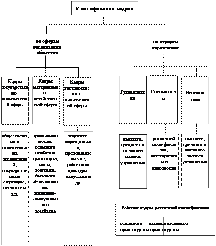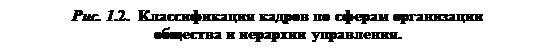 Комплексная система управления человеческими ресурсами схематически показана на рис. 1.1. 1.2. Классификация кадров. Кадры – понятие одновременно собирательное и многоуровневое. Собирательное – потому, что объединяет работников различных отраслей деятельности, профессий, специальностей, видов труда. В этом смысле употребляют выражения кадры хозяйственные, научные, медицинские, преподавательские, военные и т. п. Принадлежность работника к той или иной отрасли дает лишь наиболее общее представление о его положении в общественном разделении труда, выполняемых функциях и профессиональных качествах. Классификация кадров по основным сферам организации общества и основным уровням управления приведена на рис. 1.2.