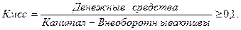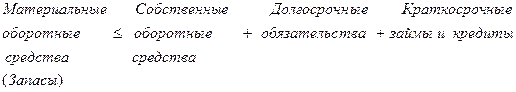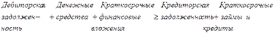 Превышение суммы всех источников финансирования оборотных средств над стоимостью материальных оборотных средств определяет возможности предприятия финансировать основную деятельность.[7] Далее необходимо изучать соотношение более ликвидных оборотных средств с текущими обязательствами. Считается, что сумма дебиторской задолженности, денежных средств и краткосрочных финансовых вложений не должна быть меньше общей величины кредиторской задолженности и краткосрочных займов и кредитов (2)[8] :