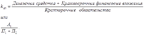 При этом если выполнены три следующих условия: А1≥П1; А2≥П2; А3≥П3, (16) т.е. текущие активы превышают внешние обязательства организации, то обязательно выполняется и последнее неравенство: А4≤П4, (17) которое подтверждает наличие у организации собственных оборотных средств. Все это означает соблюдение минимального условия финансовой устойчивости. Невыполнение же одного из первых трех неравенств, свидетельствует о нарушении ликвидности баланса. При этом недостаток средств по одной группе активов, не компенсирующейся их избытком по другой группе, так как компенсация может быть лишь по стоимости, в реальной платежной ситуации менее ликвидные активы не могут заменить более ликвидные.[32] Сравнение первой и второй групп активов (наиболее ликвидных активов и быстрореализуемых активов) с первыми двумя группами пассивов (наиболее срочные обязательства и краткосрочные пассивы) показывает текущую ликвидность, т.е. платежеспособность или неплатежеспособность организации в ближайшее к моменту проведения анализа время. Сравнение же третьей группы активов и пассивов (медленно реализуемых активов с долгосрочными обязательствами) показывает перспективную ликвидность, т.е. прогноз платежеспособности организации. Платежеспособность и финансовая устойчивость являются важнейшими характеристиками финансово-экономической деятельности предприятия в условиях рыночной экономики[33] . Платежеспособность предприятия характеризуется коэффициентами ликвидности, которые рассчитываются как отношения различных видов оборотных средств к величине срочных обязательств[34] . Различают следующие показатели ликвидности, характеризующие платежеспособность: 1. Коэффициент абсолютной ликвидности (18):