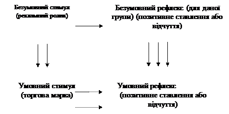 Коли умовний (УС) і безумовний (БС) стимули близькі, їх починають пов'язувати, тобто асоціювати. Безумовний стимул — це рекламний телеролик. Позитивне ставлення до рекламного ролика або позитивні відчуття є для даної групи людей безумовним рефлексом (реакцією). Необхідно так пов'язати торгову марку (умовний стимул) зі змістом рекламного ролика, щоб сам її вигляд або пригадування породжували ті самі відчуття, що виникли при перегляді реклами, тобто щоб встановився чіткий умовний рефлекс: торгова марка - відчуття задоволення. Як приклад можна назвати дослідження, проведені у США. Фонова музика (БС) асоціювалася зі звичайною ручкою (УС), слайд з кольоровим зображенням якої демонструвався під цю музику. Половина групи слухала однохвилинний фрагмент дуже популярної мелодії і дивилася слайд з ручкою бежевого кольору. Друга половина бачила ручку блакитного кольору, слухаючи класичну індійську музику, що подобається в основному тільки знавцям. Пізніше учасникам експерименту запропонували вибрати одну з кольорових ручок. Результати такі: 79 % вибрали бежеву ручку, яка асоціювалася з мелодією, що подобалась. Цікаво, що на прохання пояснити, чому вони це зробили, більшість відповіла, що їм бежевий колір більше подобається, ніж блакитний, але ніхто не згадав про музику. Дослідження другої половини XX століття встановили такі закономірності створення й використання умовних рефлексів у рекламному менеджменті: 1. Об'єднання БС і УС у пари. Сила умовного рефлексу (УР) при цьому зростає. Однак кожне наступне об'єднання дає менше зростання сили УР, ніж попереднє, а після певної кількості таких об'єднань сила УР взагалі перестає помітно зростати. Отже, рекламодавці повинні планувати достатню (але не завелику) кількість повторів (показів), щоб створити необхідні асоціації. Швидкість отримання УР залежатиме від того, наскільки цікавим і важливим буде БС для аудиторії. Ось чому важливо знайти сильний БС і міцно «прив'язати» до нього УС (торгову марку). 2. Згасання рефлексу. Дія умовного рефлексу припиниться, якщо зв'язки між БС і УС будуть розірвані (наприклад, у новій рекламній кампанії використано інший БС). Якщо звук дзвіночка (БС) на шиї у корови породжував позитивні, яскраві, веселі почуття, асоціювався з приємним молочним напоєм (УР), то з відмовою від дзвіночка зникає і УР. Згасання відрізняється від забування: дзвіночок іще можуть пам'ятати, але асоціацій уже не буде. 3. Ототожнення, яке полягає в тім, що новий умовний стимул УС1 подібний до першого УС2 і тому породжує той самий умовний рефлекс. Тому нові продукти треба рекламувати так, щоб у свідомості покупців вони могли ототожнюватися.з уже відомими і популярними. Це має особливу вагу в конкурентній рекламі, яка часто користується хоч і не дуже порядним, але досить широковживаним засобом ототожнення своїх товарів із товарами фірми-конкурента, якщо ці товари справді бездоганні або якщо фірма є відомим лідером на ринку. Найпростіше оцінити вплив чуттєвого рекламного звернення на кінцеву поведінку людей можна, дослідивши й вимірявши ставлення до самої реклами (конкретного рекламного звернення). Позитивне ставлення до нього, крім створення позитивних асоціацій з торговою маркою, встановлення стійких умовних рефлексів, може підвищувати ефективність рекламного звернення й іншими способами, зокр