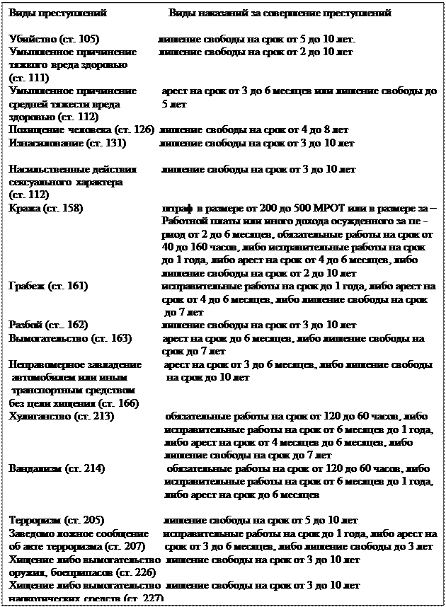 1. Введение. Я хотела выбрать наиболее актуальную проблему среди моих ровесников на сегодняшний день. На мой взгляд, такой проблемой является преступления несовершеннолетних. Актуальность темы моей работы определяется рядом обстоятельств: во – первых, общей тенденцией роста преступлений, совершаемых несовершеннолетними; во – вторых, резким сокращением учреждений, организующих культурно – просветительскую досуговую работу с несовершеннолетними, вследствие чего большая часть несовершеннолетних в свободное от учебы время оказывается предоставленным самим себе; в – третьих, изменением характера и содержания деятельности оставшихся культурно – досуговых учреждений, в частности, усилением агрессивного характера демонстрируемых кинофильмов; в – четвертых, дороговизной услуг культурно – досуговых учреждений; в – пятых, низким уровнем правовой подготовки несовершеннолетних и отсутствием личных правовых норм и ценностей, регулирующих поведение несовершеннолетних. Именно связи с этими обстоятельствами, предметом исследования явились общественно – правовые отношения и нормы, связанные с преступлениями, совершаемыми несовершеннолетними. В ходе исследования решались следующие задачи: изучение специальной литературы по вопросам уголовного права и системетизация юридических норм, определяющих виды преступлений и ответственности несовершеннолетних; систематизация правил и норм законопослушного поведения несовершеннолетних, разработка памятки в помощь несовершеннолетним; изучение причин преступности несовершеннолетних с целью выработки предложений по профилактике преступности среди несовершеннолетних; Перечисленные исследовательские задачи решались с помощью следующих методов исследования: проблемноориентированный анализ специальной литературы по вопросам уголовного права; изучение публицистических материалов и данных статистической отчетности о характере и объеме преступлений несовершеннолетних; систематизация информации о причинах преступности несовершеннолетних; конструирование практических материалов, содержащих правила и нормы законопослушного поведения несовершеннолетних и предложения по профилактике преступности. 2. Причины преступлений. Человек совершает поступки, поступки делают человека. На мой взгляд, самые безрассудные поступки свойственны молодости. Именно в раннем возрасте сам человек нередко протаптывает тропинку к высокому забору с орнаментом из колючей проволоки. Не успев еще почувствовать радость жизни, он уже катается по полу в кабинете следователя, с трудом осознавая, что наступает ответственность. Не папина, не мамина, а его ответственность. Очень много случаев, когда преступления несовершеннолетних потрясают воображение окружающих. Однако, на мой взгляд, для снижения уровня преступности нашему обществу необходимо искать пути эффективной борьбы с нею. Российский закон уделяет значительное внимание предупреждению правонарушений несовершеннолетних. Охрана нравственного здоровья подрастающего поколения предполагает эффективную борьбу с антиобщественными проявлениями. Кроме того, необходима забота о здоровье детей и подростков, об осуществлении обязательного всеобщего среднего бесплатного образования, о запрещении детского труда. Статистика предупреж