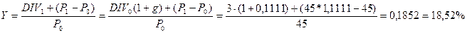 Из рисунка отчетливо видно, что при росте рыночной ставки на 1,5 % рыночная цена облигации падает на 4,98 %, а при уменьшении рыночной ставки на 0,5% -цена облигации увеличивается на 1,78%. Задача 8. Акции предприятия «Н» продаются по 45.00. Ожидаемый дивиденд равен 3,00. Инвестор считает, что стоимость акции в следующем году вырастет на 11.11 %. Определите ожидаемую доходность инвестиции. Как измениться доходность при прочих неизменных условиях, если инвестор намеривается продать акцию через два года, а ее стоимость снизится на 15 % от предыдущего уровня? Решение. 1. Определим доходность инвестиции: