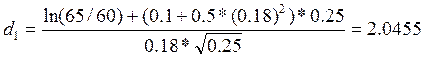 Задача 17. Текущая цена акции В составляет 65,00 ( S ). Стоимость трехмесячного опциона «колл» с ценой исполнения 60,00 ( X ) равно 6,20. Стандартное отклонение по акции В равно 0,18 ( s ) . Безрисковая ставка составляет 10 % ( r ). Определите справедливую стоимость опциона. Выгодно ли осуществлять покупку опциона? Решение. 1. Стоимость опциона «колл» определяется по модели оценки опциона Блэка – Шоулза: