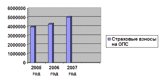 Эти тарифы предусмотрены для всех за исключением выступающих в качестве работодателей организаций, занятых в производстве сельскохозяйственной продукции, родовых, семейных коренных малочисленных народов Севера, занимающихся традиционными отраслями хозяйствования, и крестьянских (фермерских) хозяйств. Уплата страховых взносов (авансовых платежей) осуществляется отдельными платежными поручениями по каждой из частей страховых взносов в ПФР. В 2007 году в фонде работали штатниками 121 человек 1966 года рождения и старше. Налоговая база, т.е. суммы начисленных выплат и вознаграждений для начисления взносов по ним составила 16872725 р. Лиц 1967 года рождения и моложе работало - 180 человек и база для начисления взносов составила – 19089791. Таким образом, налоговая база для начисления взносов на обязательное пенсионное страхование составит: 16872725+19089791=35962516 Рассмотрим методику определения сумм начисленных платежей по страховым взносам на обязательное пенсионное страхование для лиц 1967 года рождения и моложе. Для этого необходимо рассчитать сумму начисленных платежей по страховым взносам на страховую и накопительную часть трудовой пенсии. Налоговая база для начисления страховых взносов за рассматриваемый период равна 19089791. 19089791∙10%=1908980р. –сумма начисленных платежей по страховым взносам на страховую часть трудовой пенсии за расчетный период. 19089791∙4% =763592р. – сумма начисленных платежей по страховым взносам на накопительную часть трудовой пенсии. 1908980+763592=2672572р. – сумм начисленных платежей по страховым взносам на обязательное пенсионное страхование для лиц 1967 года рождения и моложе. 16872725∙14% =2362181р. – Сумм платежей по страховым взносам на обязательное пенсионное страхование для лиц 1966 года рождения и старше. Таким образом, определим общую сумму платежей по страховым взносам на обязательное пенсионное страхование за 2007 год. 2672572+2362181= 503 4753 р. Аналогичным способом рассчитывались суммы платежей на обязательное пенсионное страхование и в 2005, 2006 годах. Для наглядности представим суммы уплаченных страховых взносов в виде диаграммы. В 2006 году выплаты Управлением ПФР в г. Владикавказ по ЕСН составили 4832273 руб. В 2007- 6367857руб. В 2008 году- 8355953. Для наглядности составим диаграмму по выплатам фонда социального налога.