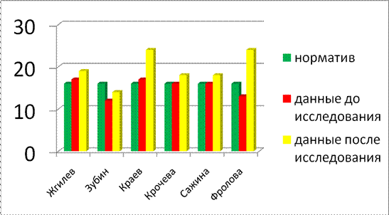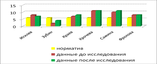 На диаграмме видно, что результаты до начала работы очень слабые. После проведения работы по коррекции результаты значительно изменились. У Жгилева данные после исследования уменьшились, это может быть связанно с неактивной работой на занятиях и дома, а так же и с перенесенными болезнями. Динамическая силовая выносливость мышц брюшного пресса