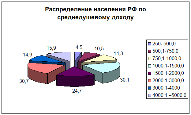 наибольшее число жителей РФ имеют среднедушевой доход в интервале 2000-3000 (руб), который и является модальным. Медиану находим по формуле: Медиана дискретного вариационного ряда определяется по сумме накопленных частот, которая должна превышать половину всего объема единиц совокупности: 145,6/2 = 72,8 cum (f) =4,5+10,5+14,3+30,1+24,7= 84,1 –следовательно, медианный интервал 1500-2000 (руб). (5)