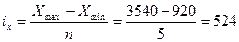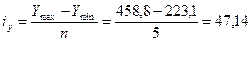 Ymax =458,8, Ymin =223,1. Делим этот интервал на 5 равных групп: