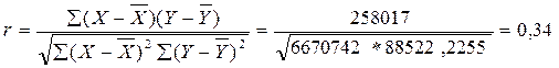 Так как этот коэффициент положителен и близок к нулю, то можно сказать, что он свидетельствует о наличии прямой слабой связи. Линейный коэффициент корреляции определяется по формуле: Для его расчета воспользуемся данными из следующей таблицы: