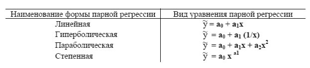 и подставив их в уравнение связи 1.4. Парная корреляция и регрессия Часто при анализе взаимосвязей социально-экономических явлений среди различных факторов, влияющих на результат, бывает важно выделить наиболее значимый факторный признак, который в большей степени обусловливает вариацию результативного признака (например, зависимость проданных туристическими фирмами путевок от затрат на рекламу или зависимость производительности труда операторов ЭВМ от стажа работы). Этим обусловлена необходимость измерения парных корреляций и построения уравнений парных регрессий. Парная корреляция характеризует тесноту и направленность связи между результативным и факторным признаками. Парная регрессия позволяет описать форму связи в виде уравнения парной регрессии (табл.2). Таблица 1 Основные виды уравнений парной регрессии