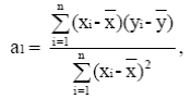 где a0 , a1 - коэффициенты (параметры) уравнения регрессии. Поскольку a0 является средним значением у в точке х=0 , экономическая интерпретация часто затруднена или вообще невозможна. Коэффициент парной линейной регрессии a1 имеет смысл показателя силы связи между вариацией факторного признака х и вариацией результативного признака у . Вышеприведенное уравнение показывает среднее значение изменения результативного признака у при изменении факторного признака х на одну единицу его измерения, то есть вариацию у , приходящуюся на единицу вариации х . Знак a1 указывает направление этого изменения. Параметры уравнения a0