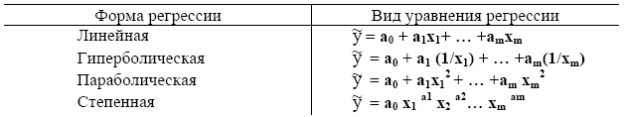где k = n-2 для малой выборки, k = n при большом числе наблюдений (n>100). Аналогично оценивается значимость коэффициента регрессии; tр рассчитывают как отношение взятого по модулю коэффициента регрессии к его средней ошибке с заданными уровнем значимости (α) и числом степеней свободы d.f.= n-2. (1.1.12) 1.5. Множественная корреляция и регрессия При анализе взаимосвязей социально-экономических явлений, как правило, выясняется, что на результат влияет ряд факторных признаков, основные из которых следует включить в регрессионную модель. При этом следует помнить, что все факторы учесть в модели невозможно по ряду причин: часть факторов просто неизвестна современной науке, по части известных факторов нет достоверной информации или количество включаемых в модель факторов может быть ограничено объемом выборки (количество факторных признаков должно быть на порядок меньше численности изучаемой совокупности). Множественная регрессия описывает форму связи в виде уравнения множественной регрессии, или регрессионной модели (табл.3). Таблица 3 Основные виды множественной регрессии