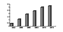 Для анализа потребления обуви требуется определить относительные величины динамики. Для выявления направления и характера изменений потребления обуви за годы Советской власти по сравнению с дореволюционным 1913 г. определим базисные темпы роста где Последовательно сравним уровни 1950, 1960, 1965 и 1969 гг. ( 1950 1,1 / 0,4 = 2,75 1960 1,9 / 0,4 = 4,75 1965 2,4 / 0,4 = 6,0 1970 3,0 / 0,4 = 7,5 1975 3,2 / 0,4 = 8,0 Из полученных базисных относительных величин динамики (темпов роста) видно, что за указанные годы потребление обуви в стране неуклонно возрастало: 2,75<4,75<6,0<7,5<8,0. В 1975 г. потребление обуви на душу населения было в 8 раз больше, чем в дореволюционном 1913 г. Для выявления характера изменений потребления обуви по отдельным периодам экономического развития произведем расчет темпов роста где Определим цепные темпы роста: 1950 1,1 / 0,4 = 2,75 1960 1,9 / 1,1 = 1,727 1965 2,4 / 1,9 = 1,263 1970 3,0 / 2,4 = 1,25 1975 3,2 / 3,0 = 1,07 Из полученных цепных относительных величин динамики (темпов роста) видно, что по отдельным этапам экономического развития также происходило увеличение потребления обуви населением. Представим исходные уровни ряда динамики в виде столбиковой диаграммы (рис. 9.). Рис. 9. Потребление кожаной обуви на душу населения в СССР в 1913 — 1975 гг. (в год пар). Данная форма графического изображения уровней ряда динамики удобна тем, что расстояние столбиков друг от друга не зависит от величины интервалов времени. Представим графически полученные в расчетах базисные относительные величины динамики. Для этой цели чаще всего используется линейная диаграмма (рис. 10.). В системе координат нанесем на ось ординат базисные темпы роста (в процентах), а на ось абсцисс — показания времени.