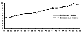 Исходные уровни ряда динамики подвержены сезонным изменениям; для определения общей тенденции развития переходят от ежемесячных уровней к годовым уровням: 1987г. - 96,7 тонн 1988г. - 98,4 тонн 1989г. - 101 тонна Эти цифры, полученные в результате перехода к годовым уровням ряда динамики, показывают общую тенденцию роста реализации молочной продукции. Другой способ определения тенденции в ряду динамики — метод скользящих средних. Суть метода заключается в том, что фактические уровни ряда заменяются средними уровнями, вычисленными по определённому правилу, например: ... ... ... В результате получается сглаженный ряд, состоящий из скользящих пятизвенных средних уровней — — сглаженный ряд короче исходного на число уровней Сглаживание методом скользящих средних можно производить по четырём, пяти или другому числу уровней ряда, используя соответствующие формулы для усреднения исходных уровней. Полученные при этом средние уровни называются четырёхзвенными скользящими средними, пятизвенными скользящими средними и т.д. При сглаживании ряда динамики по чётному числу уровней выполняется дополнительная операция, называемая центрированием, поскольку, при вычислении скользящего среднего, например по четырём уровням, — — — — Метод скользящих средних не позволяет получить численные оценки для выражения основной тенденции в ряду динамики, давая лишь наглядное графическое представление (пример 1). Пример. Таблица 1.