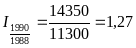 При определении по данным таблицы статистических индексов первый период принимается за базисный, в котором цена единицы товара принимается Второй период принимается за текущий (или отчетный), в котором цена единицы товара обозначается Индивидуальные индексы показывают, что в текущем периоде по сравнению с базисным цена на товар А повысилась на 25%, на товар Б осталась без изменения, а на товар В снизилась на 33%. Количество реализации товара А возросло на 27%, товара Б — на 25%, а товара В — на 50%. При определении общего индекса цен в агрегатной форме сумма стоимости продажи товаров в текущем периоде по ценам того же текущего периода. В знаменателе индексного отношения образуется значение Агрегатная формула такого общего индекса цен имеет следующий вид: Расчёт агрегатного индекса цен по данной формуле предложил немецкий экономист Г. Пааше, поэтому он называется индексом Пааше. Применяем формулу для расчёта агрегатного индекса цен по данным табл.1: числитель индексного отношения знаменатель индексного отношения Полученные значения подставляем в формулу 1: Применение формулы 1 показывает, что по данному ассортименту товаров в целом цены повысились в среднем на 13,9%. При другом способе определения агрегатного индекса цен в качестве соизмерителя индексируемых величин В знаменателе индексного отношения образуется значение Агрегатная формула такого общего индекса имеет вид: Расчёт общего индекса цен по данной формуле предложил немецкий экономист Э. Ласпейрес, и получил название индекса Ласпейреса. Применяем формулу для расчёта агрегатного индекса цен по данным табл.1: числитель индексного отношения знаменатель индексного отношения Полученные значения подставляем в формулу 2: Применение формулы 2 показывает, что по данному ассортименту товаров в целом цены повысились в среднем на 14,4%. Таким образом, выполненные по формулам 1 и 2 расчёты имеют разные показания индексов цен. Это объясняется тем, что индексы Пааше и Ласпейреса характеризуют различные качественные особенности изменения цен. Индекс Пааше характеризует влияние изменения цен на стоимость товаров, реализованных в отчётном периоде. Индекс Ласпейреса показывает влияние изменения цен на стоимость количества товаров, реализованных в базисном периоде. Другим важным видом общих индексов, которые широко применяются в статистике, являются агрегатные индексы физического объёма товарной массы. При определении агрегатного индекса физического объёма товарной массы Агрегатная форма общего индекса имеет следующий вид: Поскольку, в числителе формулы 3 содержится сумма стоимости реализации товаров в текущем периоде по неизменным (базисным) ценам, а в знаменателе — сумма фактической стоимости товаров, реализованных в базисном периоде в тех же неизменных (базисных) ценах, то данный индекс является агрегатным индексом товарооборота в сопоставимых (базисных) ценах. Используем формулу 3 для расчёта агрегатного индекса физического объёма реализации товаров по данным табл.1: числитель индексного отношения знаменатель индексного отношения Полученные значения подставляем в формулу 3: Применение формулы 3 показывает, что по данному ассортименту товаров в целом прирост физического объёма реализации в текущем периоде составил в среднем 27,8%. Агрегатный индекс физического объёма т