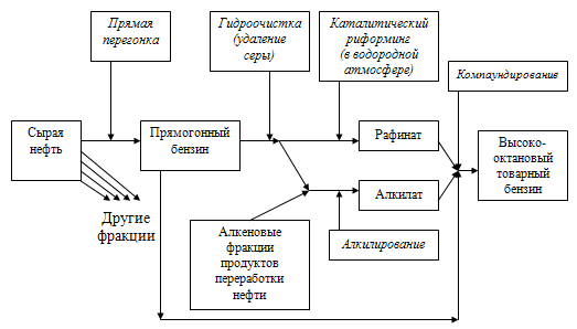 Схема 3 Двухстадийный синтез диметилового эфира из природного газа 2.3 Нетрадиционные процессы и технологии получения моторных топлив В Институте катализа СО РАН разработан ряд нетрадиционных процессов и технологий получения высококачественных бензинов и дизельных топлив на основе различных углеводородных фракций – средних нефтяных дистиллятов, газовых конденсатов, широкой фракции легких углеводородов и легких углеводородных газов. 2.3.1 Технология БИМТ (Боресков Институт Моторные Топлива) –одностадийная переработка средних нефтяных дистиллятов и газовых конденсатов Данная технология позволяет получать высокооктановые бензины, зимнее дизельное топливо и сжиженный газ С3-С4. Процесс проводится на цеолитном катализаторе ИК-30-БИМТ, не содержащем благородных металлов, в реакторах со стационарным слоем катализатора при температуре 350-450 ºС и давлении до 20 атм. Сырьем могут быть прямогонные нефтяные фракции (начало кипения 35-350ºС) или нестабильные газовые конденсаты без предварительной их разгонки. Содержание общей серы в сырье не лимитируется. Длительность межрегенерационного пробега катализатора в режиме подъема температуры составляет 150-280 ч в зависимости от рабочих параметров процесса и состава получаемых продуктов. Данная технология имеет ряд существенных преимуществ перед стандартной технологией переработки нефти. По стандартной схеме нефть поступает в блок первичной перегонки, где она разделяется на бензиновую, керосиновую, дизельную фракции, тяжелый вакуумный газойль и гудрон. Каждая из этих фракций далее подвергается облагораживанию по своей технологической схеме. Так, например, для производства высокооктанового бензина (схема 4) прямогонный бензин подается на гидроочистку и далее одна часть направляется на риформинг для получения рафината (концентрат ароматических углеводородов), а другая часть – на стадию алкилирования. Путем компаундирования получают высокооктановый бензин. В случае получения зимнего дизельного топлива прямогонная дизельная фракция должна пройти стадии гидроочистки и депарафинизации.