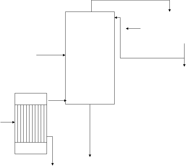 Условие задачи. 2 Схема ректификационной установки 3 Исходные данные: 3 Равновесные данные: 4 1. Построение диаграмм x-y и x,y - t по равновесным данным. 4 Диаграмма 1 4 Диаграмма 2 4 2. Пересчет из абсолютных концентраций в мольные. 4 3. Расчет минимального флегмового числа. 5 4. Расчет рабочего флегмового числа. 5 5. Построение рабочей линии. 5 6. Расчет КПД тарелок. 5 7. Определение числа тарелок. 6 8. Расчет потоков дистиллята и кубового остатка. 5 9. Расчет габаритов колонны 6 а) Расчет для верха колонны. 6 б) Расчет диаметра низа колонны. 7 10. Расчет высоты тарельчатой части. 7 11. Расход тепла, отдаваемого охлаждающей воде в дефлегматоре-конденсаторе. 8 12. Расчет средней движущей силы теплопереноса. 7 13. Расход охлаждающей воды. 714. Поверхность теплообмена конденсатора. 8Список литературы 9 Рассчитать тарельчатую ректификационную колонну непрерывного действия для разделения бинарной смеси метанол – этанол , подаваемой в колонну при температуре равной температуре кипения. Колонна работает под атмосферным давлением. Исходные данные : расход g 1 = 4,2 кг/с , процентные массовые концентрации: исходной смеси a 1 = 32% , дистиллята a 2 = 95% , кубового остатка a 0 = 2% , коэффициент избытка флегмы 4 , давление греющего пара P гр =1,5 ата , начальная температура охлаждающей смеси t ’ в = 18 0 C . Определить: 1. Реальное и теоретическое число тарелок в отгонной и укрепляющих частях; 2. Диаметр верха и низа колонны и высоту тарельчатой части; 3. Расход охлаждающей воды в конденсаторе (температурой воды на выходе из конденсатора задаться); 4. Рассчитать поверхность теплообмена конденсатора. Схема ректификационной установки