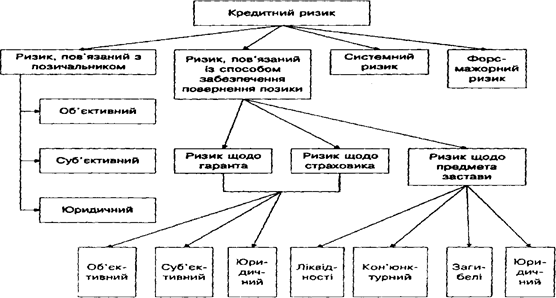 Рис. 1.1. Структура кредитного ризику Більшість комерційних банків України до недавнього часу при оцінці кредитного ризику враховували лише одне з можливих його джерел – фінансові можливості позичальника (об‘єктивний ризик пов’язаний з позичальником ) . Практика показала , що дуже багато позичальників не повертають кредити не тому , що не мають можливості, а тому , що не бажають цього робити. В цьому випадку банк вимушений подавати до суду і може зіткнутися з проблемою недосконалості укладення кредитної угоди . Це стосується всіх угод укладених під час кредитування. Це показує , що при оцінці кредитного ризику конче необхідно враховувати юридичний ризик .[15] Особливу увагу в умовах кризи в нашій країні слід також приділяти впливу на кредитний ризик ризику виникнення форс-мажорних обставин. Також при кредитуванні слід враховувати, що в чистому вигляді ризики не зустрічаються , вони накопичуються та корелюють між собою, утворюючи системний ризик. [22] Таблиця 1.1. Характеристики джерел кредитного ризику.