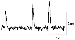 Спонтанные постсинаптические токи, генерируемые мышечным волокном. Каждый сигнал - ответ на действие порции медиатора, освободившегося из синаптических пузырьков