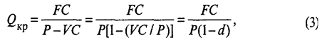 Цель анализа — определить точку критического объема продаж, выше которой идет зона прибыльности предприятия, ниже — зона убытков. Точка критического объема Тк в денежном выражении равна: