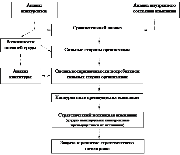 Рисунок 2. Процесс формирования конкурентных преимуществ фирмы. Основой стратегического потенциала компании является категория трудно имитируемых конкурентных преимуществ. Выделяют конкурентное преимущество, которое соперники могут скопировать и устойчивое конкурентное преимущество, недоступное для копирования конкурентами. Для организации предпочтительнее выделение категории трудно имитируемых конкурентных преимуществ, так как ввиду постоянного стремления конкурентов копировать отличительные особенности компании, ее сильные стороны не могут быть вечными и полностью быть недоступными конкурентам. Но для повышения конкурентоспособности компании необходимо формировать и развивать такие конкурентные преимущества предприятия, которые были бы если и не вечными, то могли бы быть скопированы конкурентами со значительными затратами времени и ресурсов, что, в свою очередь, давало бы организации возможность одновременно развивать иные отличительные компетенции взамен потенциально подлежащих имитации. В качестве подобных трудно имитируемых конкурентных преимуществ можно выделить организационную культуру фирмы; уникальные характеристики менеджмента предприятия, например, эффективную мотивационную политику, стиль руководства, четкую координацию и контроль деятельности, оптимально построенную организационную структуру и др.; отличительные особенности человеческих ресурсов организации (высокая квалификация и богатый практический опыт персонала, инициативность, неординарность мышления, умение принимать решения и нести за них ответственность в нестандартных ситуациях и т.д.); качество товара, производства, системы сбыта и сервиса и т.п. К ним также могут относиться более высокий уровень производительности производственного, технического, коммерческого персонала, управленческое мастерство, стратегическое мышление на различных уровнях управления, отражающееся в экономическом росте. Структура процесса формирования трудно имитируемых конкурентных преимуществ представлена на рисунке 3. [1, с.14]. Рисунок 3. Процесс формирования трудно имитируемых конкурентных преимуществ организации. Выделение этапа формирования конкурентных преимуществ фирмы в процессе стратегического планирования организации обусловливается и направленностью данного процесса на определение смысла существования компании и нахождение способов выполнения предприятием своего предназначения во внешнем окружении. Такая взаимосвязь определяется значением самой миссии компании и особенностями этого понятия. Миссия закладывает основу формирования конкурентоспособной стратегии предприятия, поскольку раскрывает истинные функции бизнеса и устанавливает границы для усилий фирмы, задает горизонты для ее роста. По сути, сформулированная миссия предприятия позиционирует его в окружающей среде, а, соответственно, и обусловливает элементы среды фирмы, влияющие на возможности формирования и развития конкурентных преимуществ компании. Управление конкурентоспособностью товаров и организации в современных условиях осуществляется на основе соблюдения следующих принципов: - анализа механизма действия экономических законов (закона спроса и предложения, закона возвышения потребностей человека, закона эффекта масштаба, закона конкуре