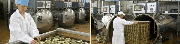 Укладка консервных банок перед старилизацией. Консервный цех, автоклавное отделение