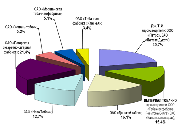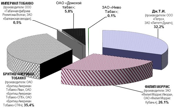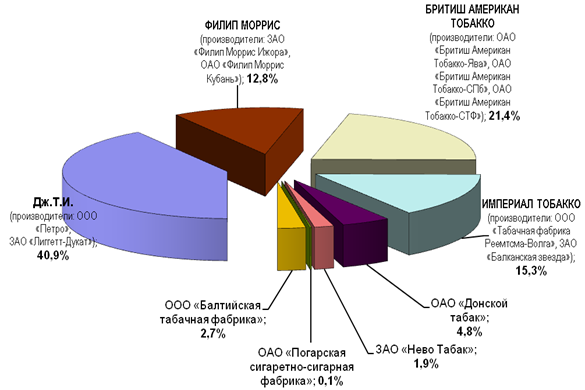 Таким образом, к началу 2009 года российский рынок табачных изделий фактически был поделен между шестью ведущими международными табачными компаниями и характеризовался значительной степенью концентрации. В начале 2009 года наметились процессы повышения уровня концентрации на рынке табачных изделий. Некоторые из хозяйствующих субъектов, осуществляющих свою деятельность на рынке табачных изделий, имеют долю более 50% в определенных ценовых сегментах рынка, при этом деятельность некоторых компаний, как, например, в случае Джапан Тобакко и Галлахер, является взаимодополняющей в рамках ассортимента продукции (тогда как все марки сигарет Галлахер, произведенные промышленным путем, занимают, в основном, позиции в низких ценовых категориях, марки Джапан Тобакко, в основном занимают позиции в высоких ценовых категориях). Компанией «Бизнес Аналитика» был предложен принцип ценовой сегментации, заключающийся в том, что марки сигарет раз и навсегда закрепляются в определенном сегменте на основании цен исходного периода. В дальнейшем, марки сигарет не меняют своей принадлежности к сегменту, несмотря на рыночные колебания средней цены (даже если из-за них марка выходит за ценовые границы сегмента, к которому она отнесена), за исключением случаев ценового перепозиционирования. Критерием ценового перепозиционирования компания «Бизнес Аналитика» предложила считать изменение цены марки сигарет на 50% ценового диапазона (т.е. разницы между верхней и нижней границами) ее первоначального сегмента, в том случае, если при этом изменении цена марки пересекла мягкую границу исходящего сегмента. Мягкие границы сегментов устанавливаются следующим образом: верхняя мягкая граница = верхняя жесткая граница + ценовой диапазон вышестоящего сегмента/10); нижняя мягкая граница = нижняя жесткая граница - ценовой диапазон нижестоящего сегмента/10); Компания «AC Nielsen» представила обзор рынка сигарет, в котором предложила не только свое видение деления рынка сигарет на ценовые сегменты, но и деление рынка сигарет на такие сегменты как сегменты сигарет различной крепости, различной толщины, с различным типом фильтра. В результате был выработан общий подход к ценовой сегментации рынка. Было принято условное деление рынка на 6 ценовых сегментов, а именно: - «Суперпремиальный» (цена за пачку сигарет более 33,20 руб.); - «Премиальный» (от 22,64 до 33,20 руб. за пачку сигарет); - «Среднеценовой» (от 18,11 до 22,64 руб. за пачку сигарет); - «Доступный» (от 12,07 до 18,11 руб. за пачку сигарет); - «Дешевый с фильтром» (менее 12,07 руб. за пачку сигарет); - «Сигареты без фильтра, папиросы». В результате анализа представленной ведущими табачными производителями информации об объемах производства сигарет с учетом ценового сегментирования рынка установлено следующее. По итогам 2008 года основные производители сигарет в России занимают следующие позиции: - компания «ДЖАПАН ТОБАККО Инк.» (производители: ООО «Петро», г.С-Петербург; ЗАО «Лиггетт-Дукат», г.Москва), имеет долю на рынке в размере 36,7%; - компания ФИЛИП МОРРИС (производители: ЗАО «Филип Моррис Ижора», Ленинградская обл.; ОАО «Филип Моррис Кубань», г.Краснодар), имеет долю на рынке в размере 22,1%; - компания БРИТИШ АМЕРИКАН ТОБАККО (производители: ОАО «Бритиш Американ Тобакко-Ява», г.Москва; ОАО «Бритиш Американ Тобакко-СПб», г.С-Петербург; ОАО «Бри